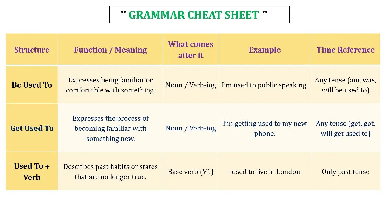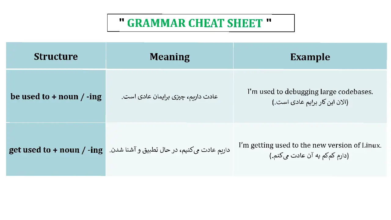 📌یادتون باشه: عبارت “Get used to” شبیه فرآیند نوشتن کده (یعنی در حال سازگاری با یه وضعیت جدید هستید). اما “Be used to” شبیه زمانیه که کد شما کامپایل شده و بدون باگ اجرا میشه (یعنی کاملاً عادت کردهاید و وضعیت عادیه).