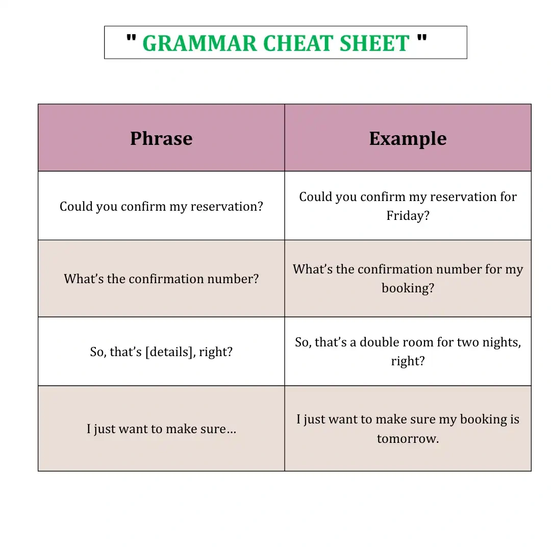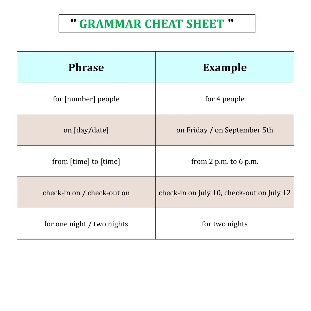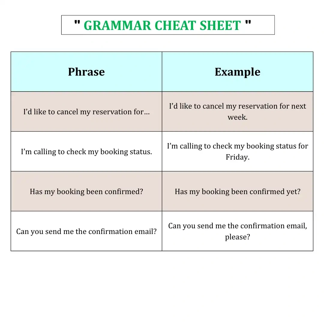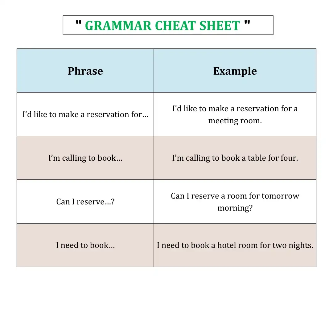 📌 این مرحله برای زمانی است که میخواهید مکالمه را شروع کنید و هدف رزرو خود را بگویید. عباراتی در این جدول به شما کمک میکند شروع مودبانه و واضحی داشته باشید.