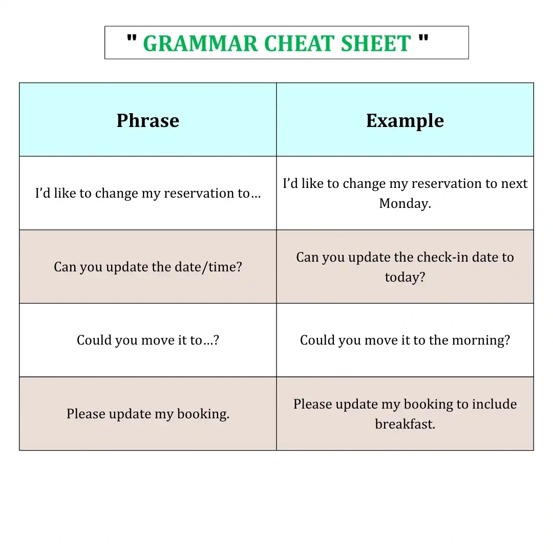 📌اگر بخواهید تاریخ، ساعت یا هر جزئیات دیگری از رزرو را تغییر بدهید، از عبارات این جدول استفاده میکنید.