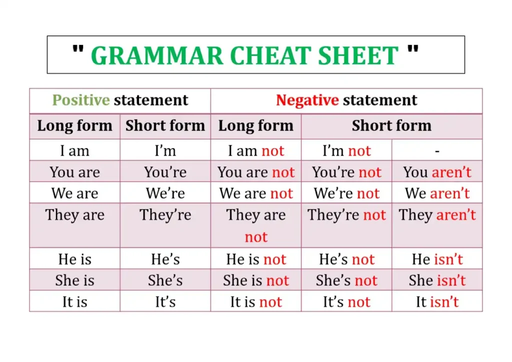 در جملات، می‌توانیم از فرم بلند (Long form) یا فرم کوتاه (Short form) استفاده کنیم. فرم کوتاه بیشتر در مکالمات روزمره و زبان غیررسمی استفاده می‌شود. همچنین، برای منفی کردن جملات، از not بعد از فعل to be استفاده می‌کنیم که می‌تواند در حالت کوتاه هم ظاهر شود.